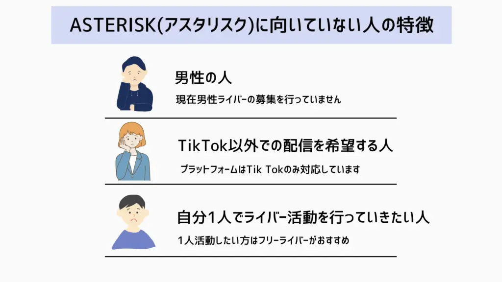 | アスタリスク | ・女性のみ募集 ・TikTokライブ完全特化 | ・女性が活動しやすい環境 ・TikTokライブに関するノウハウが豊富 | ・男性は所属できない ・TikTokライブ以外の配信アプリに対応していない |