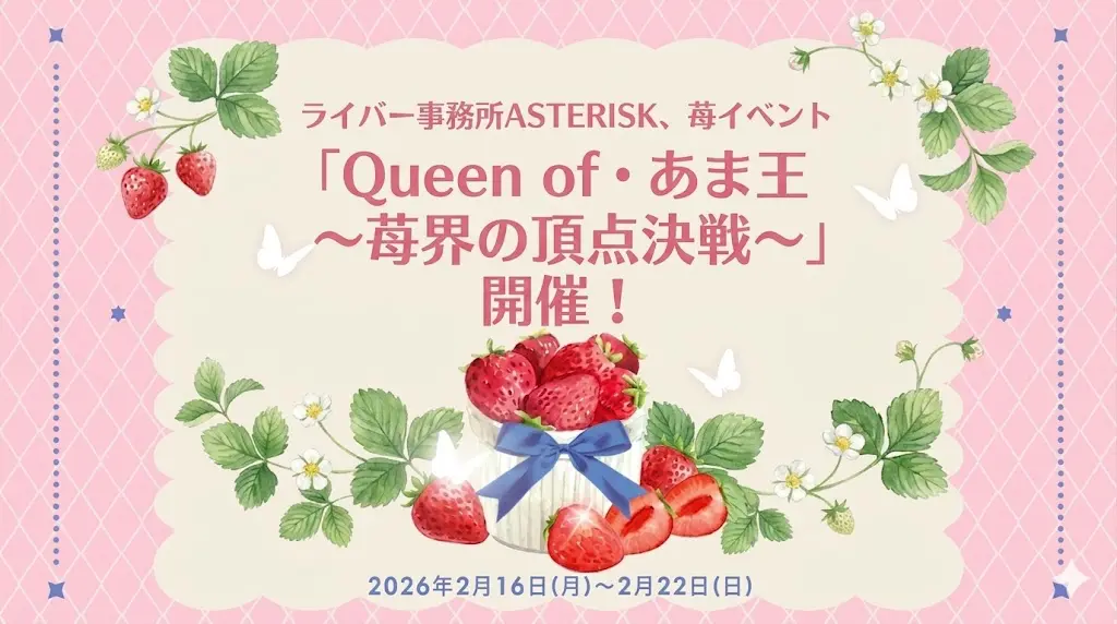 2026年2月16日から22日までの期間、ライバー事務所「ASTERISK(アスタリスク)」は、事務所イベント「Queen of・あま王 〜苺界の頂点決戦〜」を開催した。 配信中の枠投げ・バトル・配信時間をポイント化してランキングを競う形式で、上位入賞者には高級イ... -