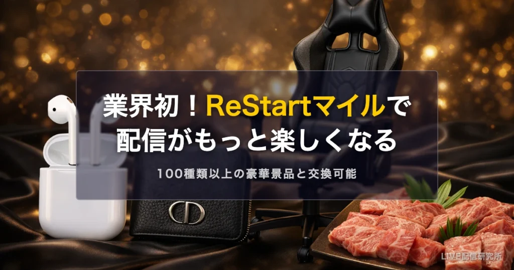 ライバー事務所ReStart(リスタート)は独自のポイントシステム「ReStartマイル」を提供している。 配信活動やイベント参加で貯めたマイルを、100種類以上の豪華景品と交換できる業界初の制度だ。 本記事では、ReStartマイルの仕組みや貯め方、交換できる景... -