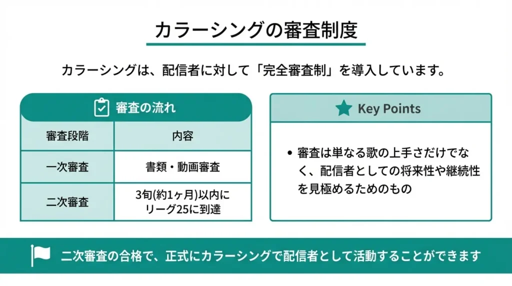 カラーシングは、配信者に対して完全審査制を導入しています。