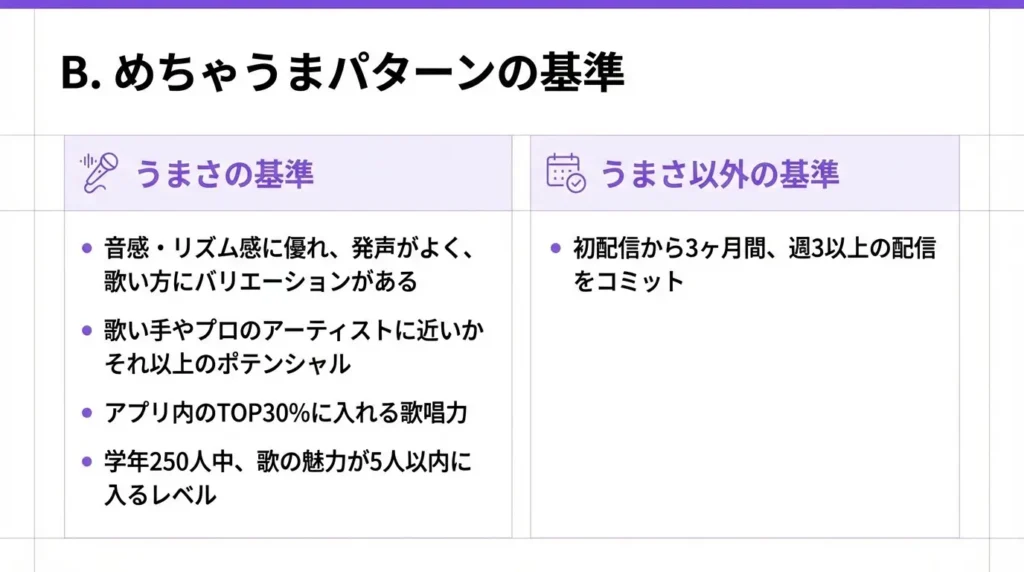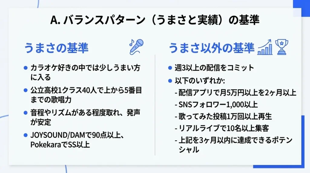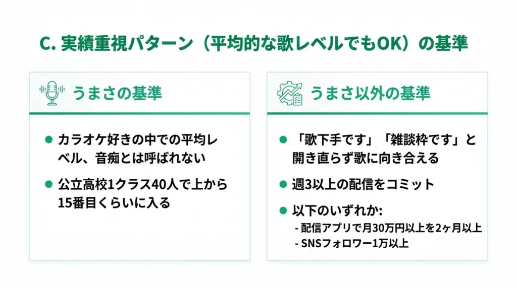 このパターンは、歌唱力とSNSでの活動実績の両方が一定水準にある、バランスの取れた応募者が対象です。