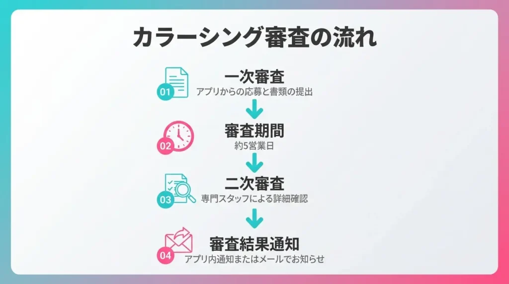 カラーシングの審査は、応募から合格まで大きく4つのステップで構成されています。