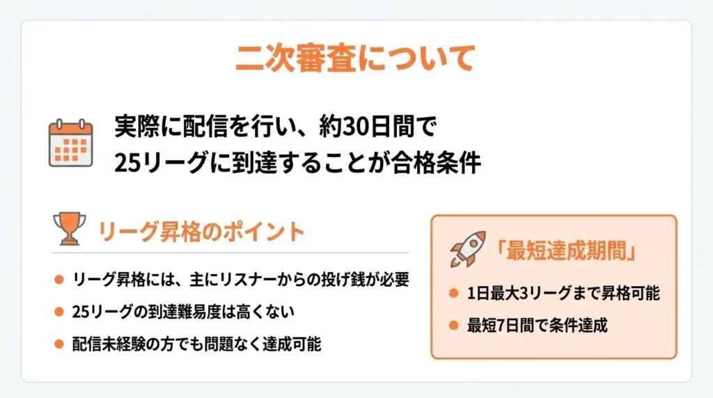 合格の条件は、審査期間である「3旬(約1ヶ月)」以内に「リーグ25」に到達することであり、配信者としての素質が試されます。