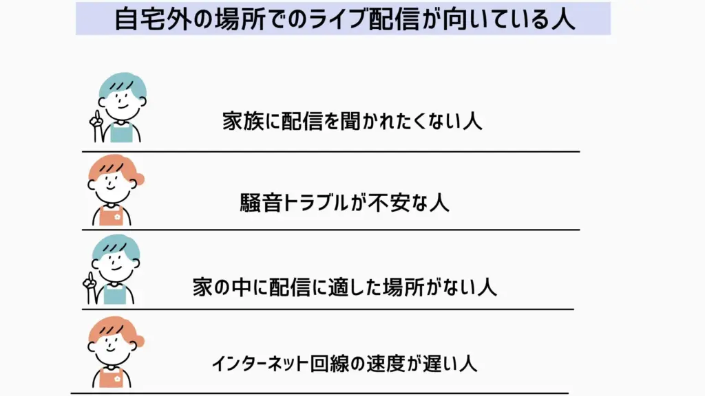 ここでは、具体的にどのような人が自宅外での配信を検討すべきかを解説します。
