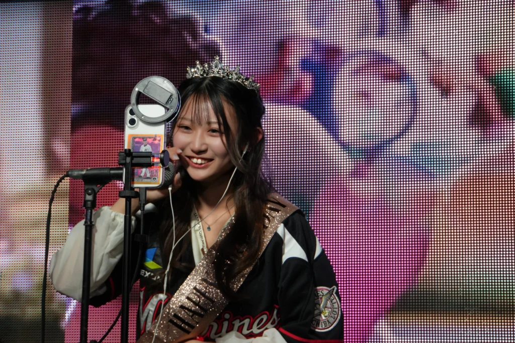 ASTERISK所属のあくあは、千葉ロッテ・マリーンズのユニフォームにティアラというスタイルで登場した。