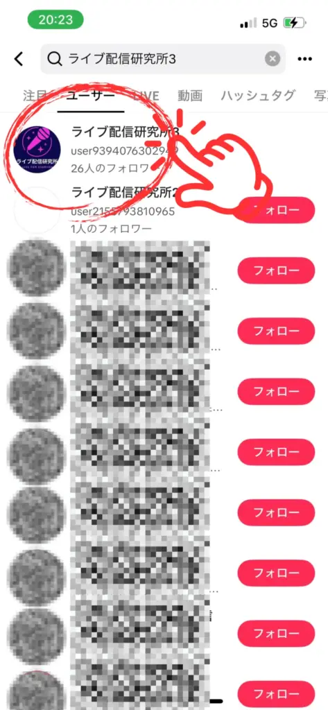 ブロックされた場合、相手のユーザー名を検索しても、検索結果に相手アカウントが表示されません。