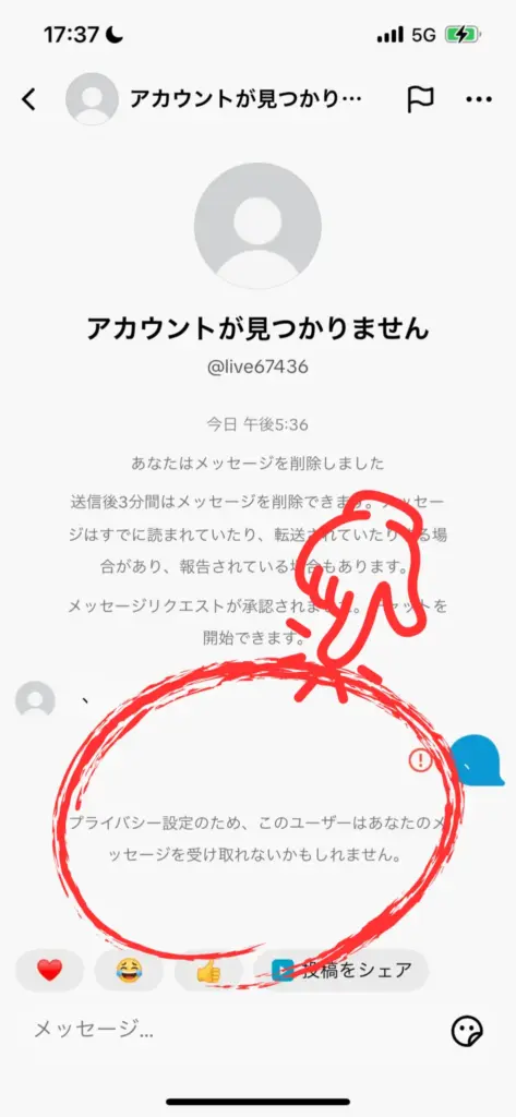 ブロックされた場合、DMを送受信できなくなり、「アカウントが見つかりません」と表示されます。