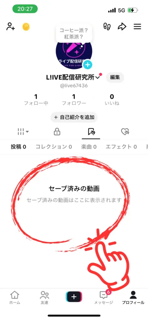 プロフィール画面の「保存」タブをタップ。