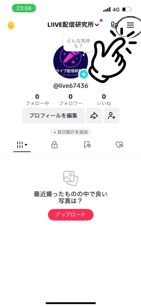 まず、プロフィール画面から、画面右上の「三本線」アイコンをタップします。