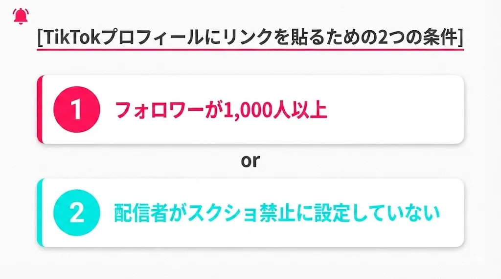 TikTokのプロフィールにリンクを貼るための条件は、以下の2つです。