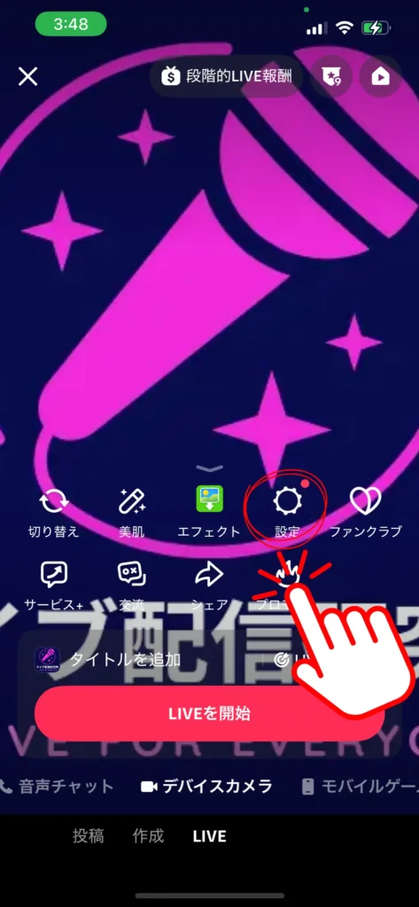 まず、TikTokライブ配信準備画面を開きます。