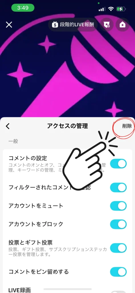 次に、画面中央右の「削除」をタップ。