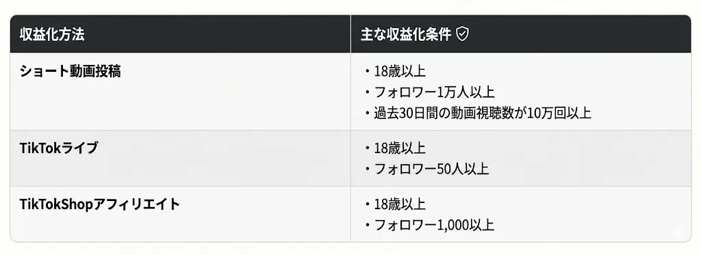 動画投稿は収益化条件が厳しめですが、ライブ配信やTikTok Shopアフィリエイトは比較的ハードルが低いのが特徴です。