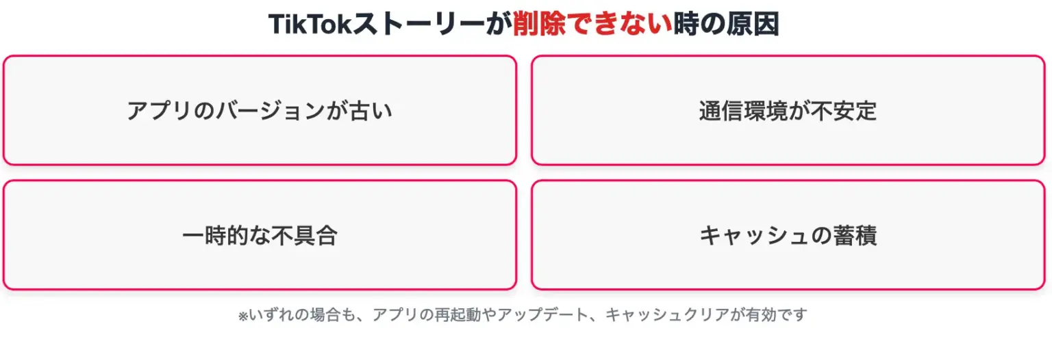 ここでは、TikTokのストーリーが上記の方法で消せない場合の原因と対処法を解説します。