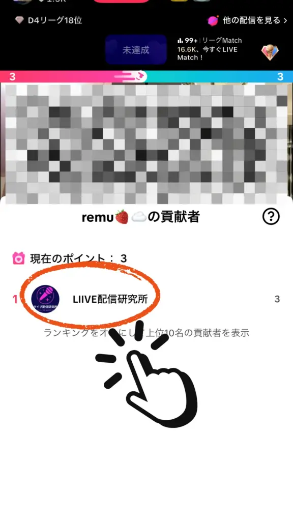 TikTokバトルでタップした際に、貢献者一覧に3ポイント貢献の表示があれば、正常にタップが反映されています。