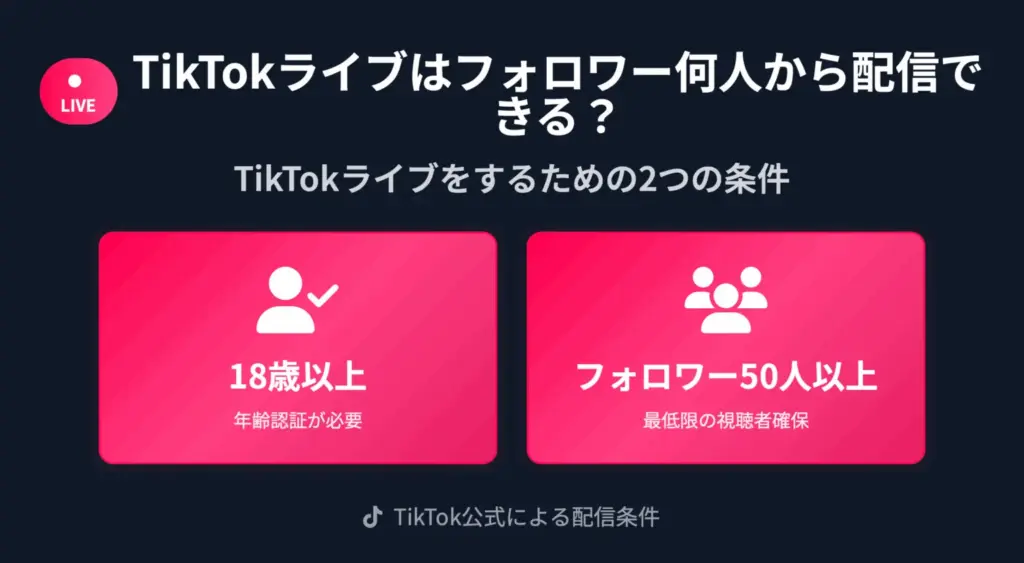 TikTok公式によると、「TikTokライブを開始するには、18歳以上・フォロワー50人以上」と明記されています。